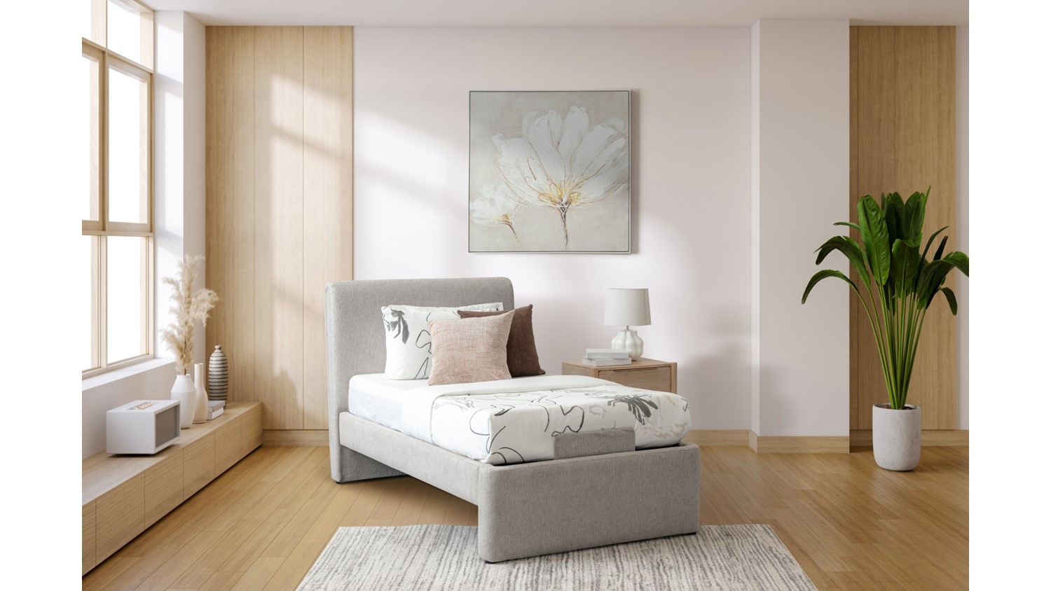 Elevate your sleep experience with the Zory Super Single Adjustable Bed, designed for both style and comfort. Featuring a sleek light grey upholstered finish, this bed combines modern aesthetics with practical functionality.
