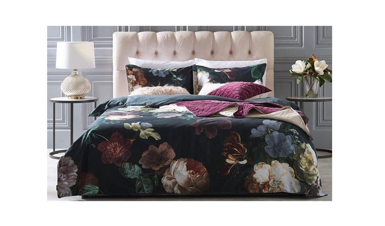 Patterned with a gorgeous digital print of flowers in the style of a painters canvas this duvet cover set combines opulent green, blue and red colors for a dark and romantic style.