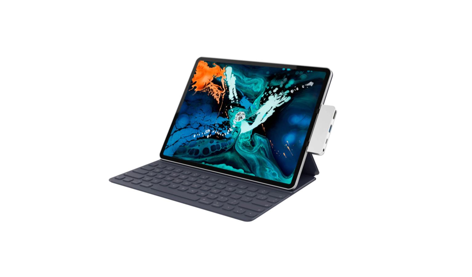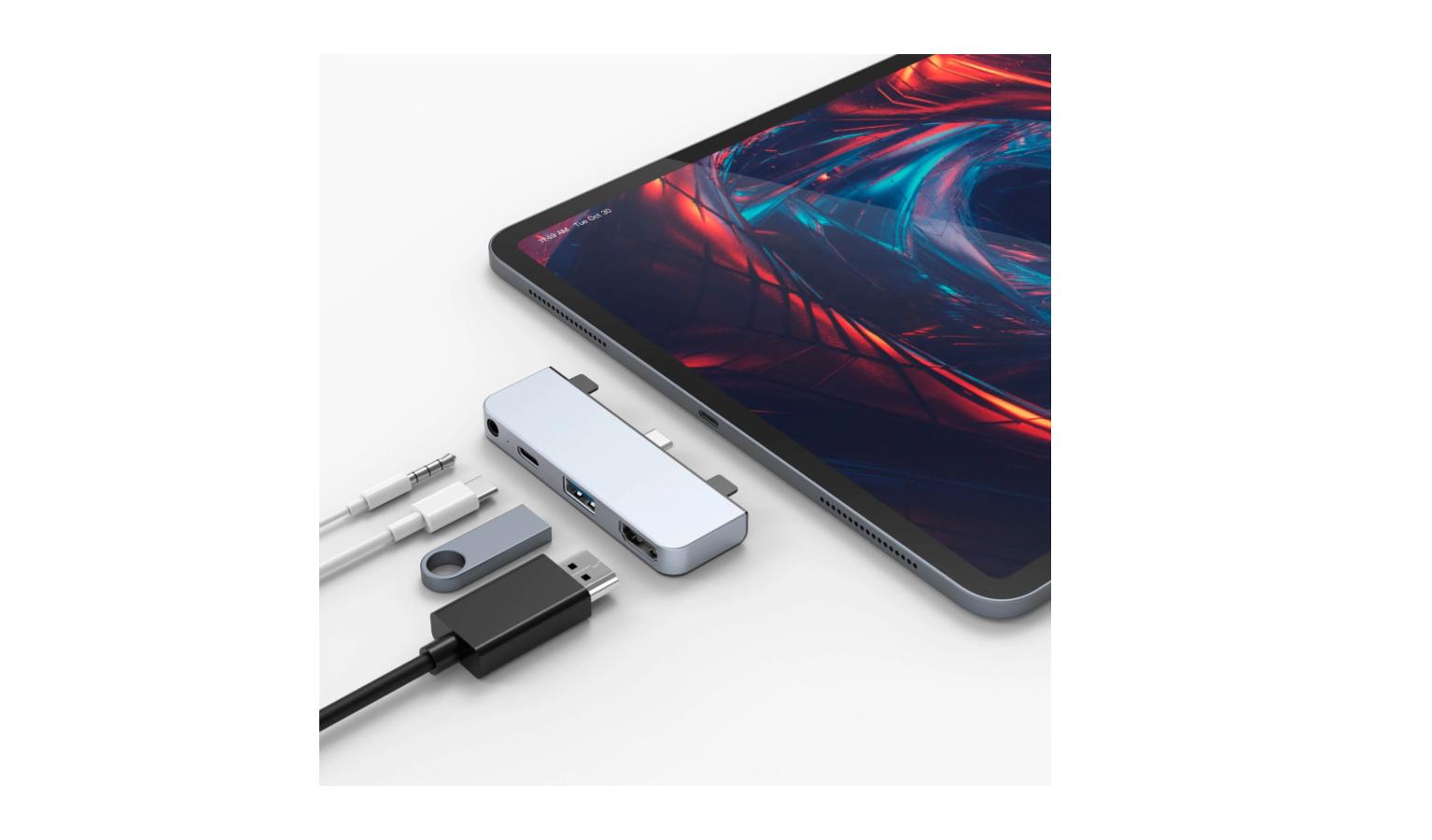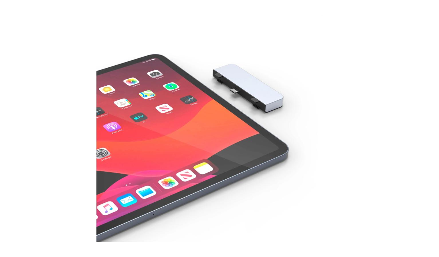 Form-fitting USB-C hub for iPad Pro, iPad Air, and iPad mini 6. This USB-C docking station attaches to the iPad adding 4 ports: 4K 30Hz HDMI, USB-C power delivery, USB-A, and audio jack.