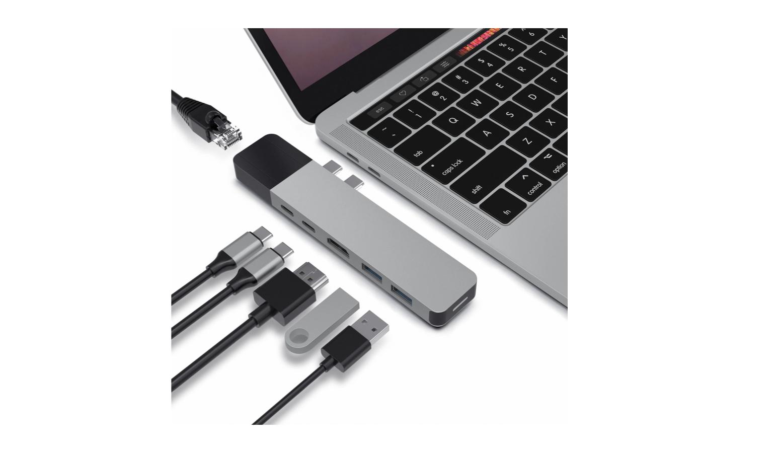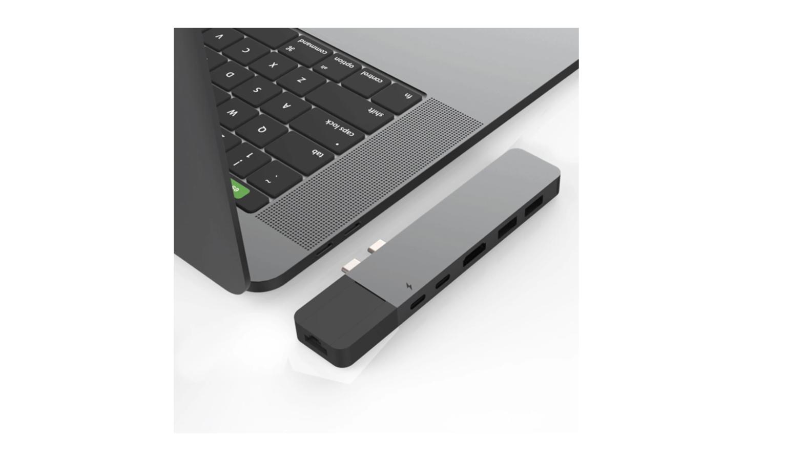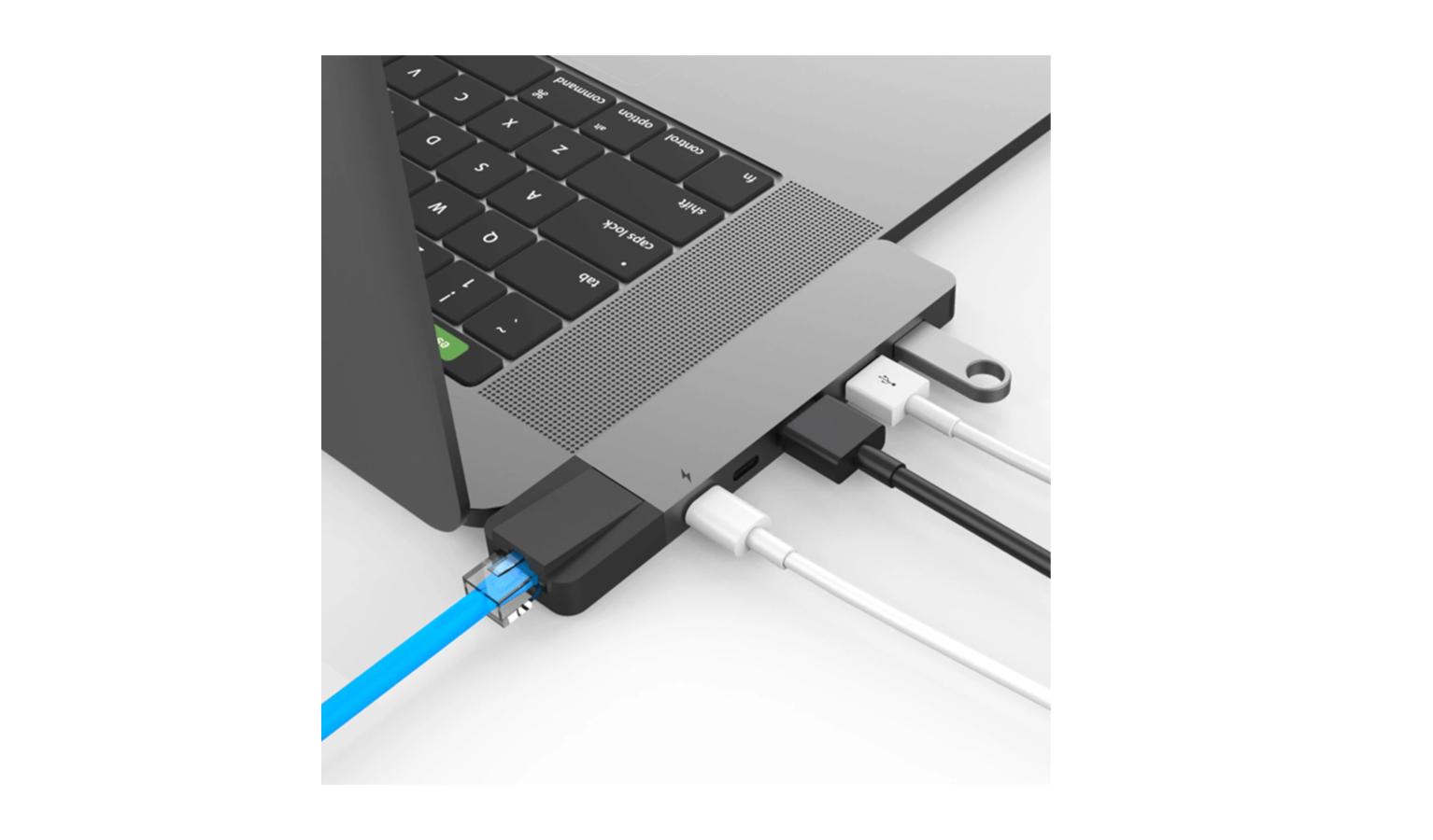 Form-fitting USB-C hub for MacBook Pro and MacBook Air. This powerful USB-C adapter adds 6 ports: gigabit ethernet adapter, 4K HDMI, 100W USB-C power delivery, and more.