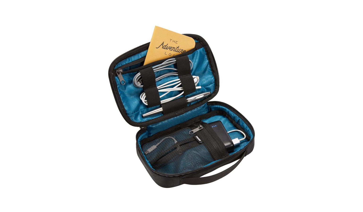 An electronics travel case for organizing and transporting a portable charger, cords and accessories.
