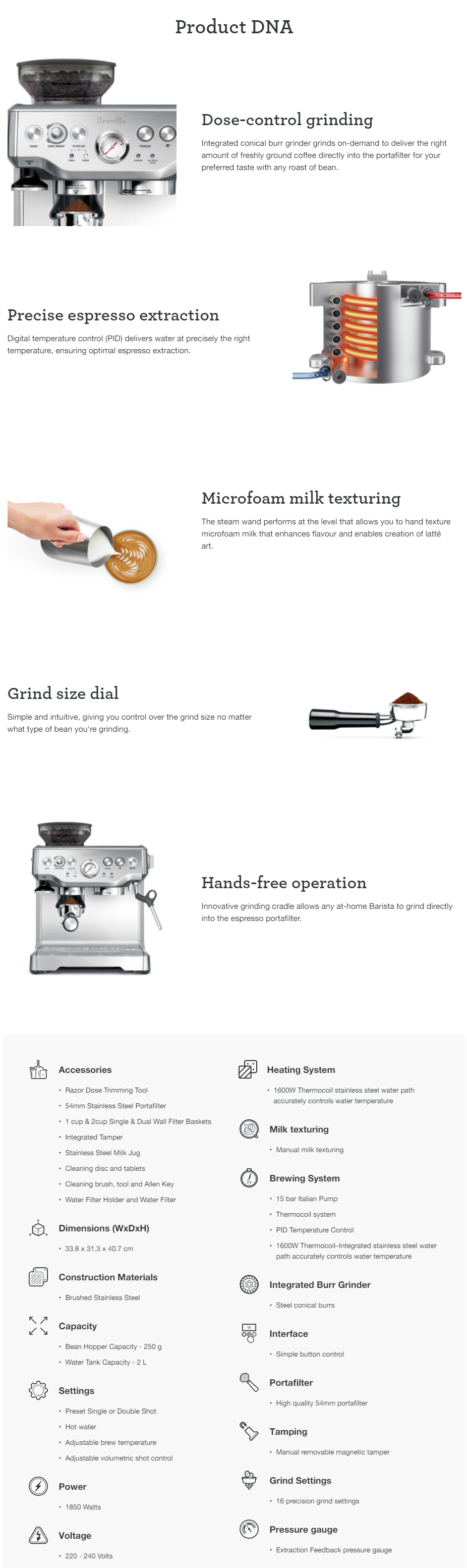 The all-in-one espresso machine. Create third wave specialty coffee at home –from bean to espresso– in less than a minute. The Barista Express allows you to grind the beans right before extraction for full flavour and precise temperature control (PID) ensures optimal espresso extraction. Be hands on like a barista with manual microfoam milk texturing to deliver authentic café style results in no time at all.