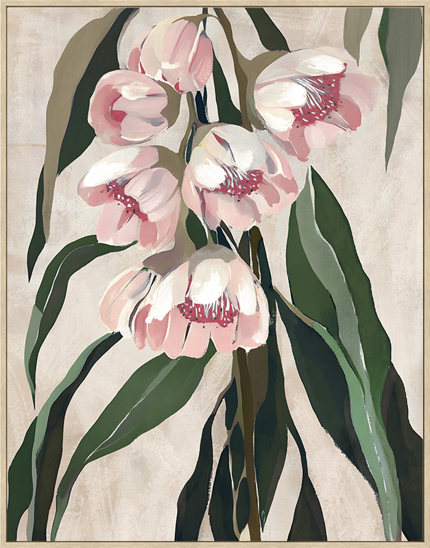 Introduce soft serenity and modern style with the Hanging Ard Framed Canvas Art. This beautiful piece features an abstract, yet delicate, representation of blush pink, bell-shaped flowers hanging gracefully amidst long, sweeping strokes of deep green foliage.