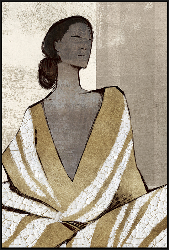 The figure is draped in a beautiful garment featuring bold, striped patterns in rich Metallic Gold and creamy White. This piece utilizes a stunning crackle-effect texture on the white and background areas, giving it the rich, aged quality of a vintage fresco or a heavily treated mixed-media painting. Encased in a dark frame, this artwork is an elegant statement piece for modern, global, or luxurious interiors.
