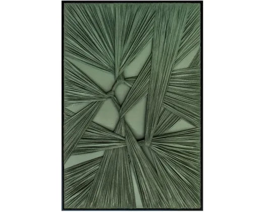 The threads are expertly arranged to intersect and overlap, forming high-energy visual lines and a compelling three-dimensional surface. This depth is beautifully contrasted by a smooth acrylic base in a matching soft green tone. The entire piece is encased in a sleek Black Frame made from durable Pine Wood.