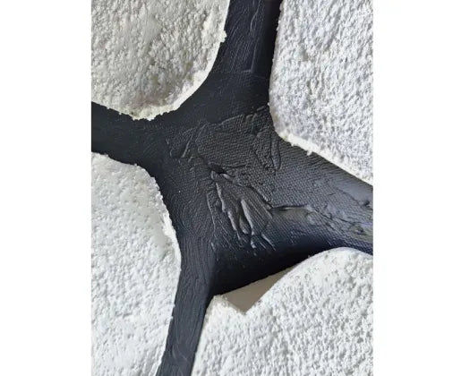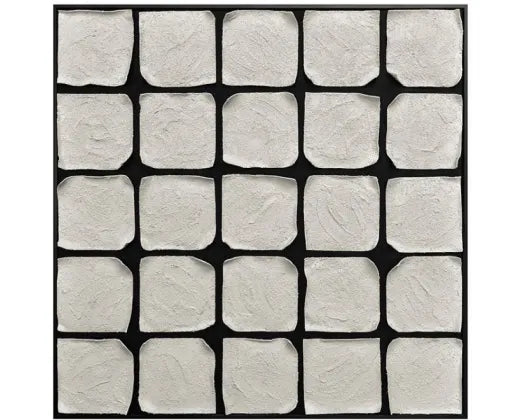 Elevate your interior design with this compelling Textured White Square 3D Wall Panel. This striking piece of decorative art features an arrangement of individual square modules, each finished with a rough, handmade texture in a soft off-white or light neutral tone. The squares are dramatically framed by a deep black grid, creating high contrast and a powerful sense of modern, three-dimensional depth.