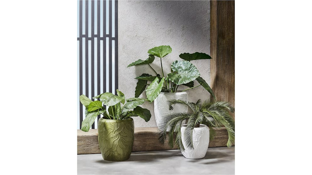 Flex your green thumb with the stately and stunning Leaf Planter. An ideal home for lush greenery, a ceramic construction offers an optimal home for soil and water, enabling plants to thrive and grow. Embossed with a flourishing foliage pattern, this intricate detail adds natural vibrancy to every setting.