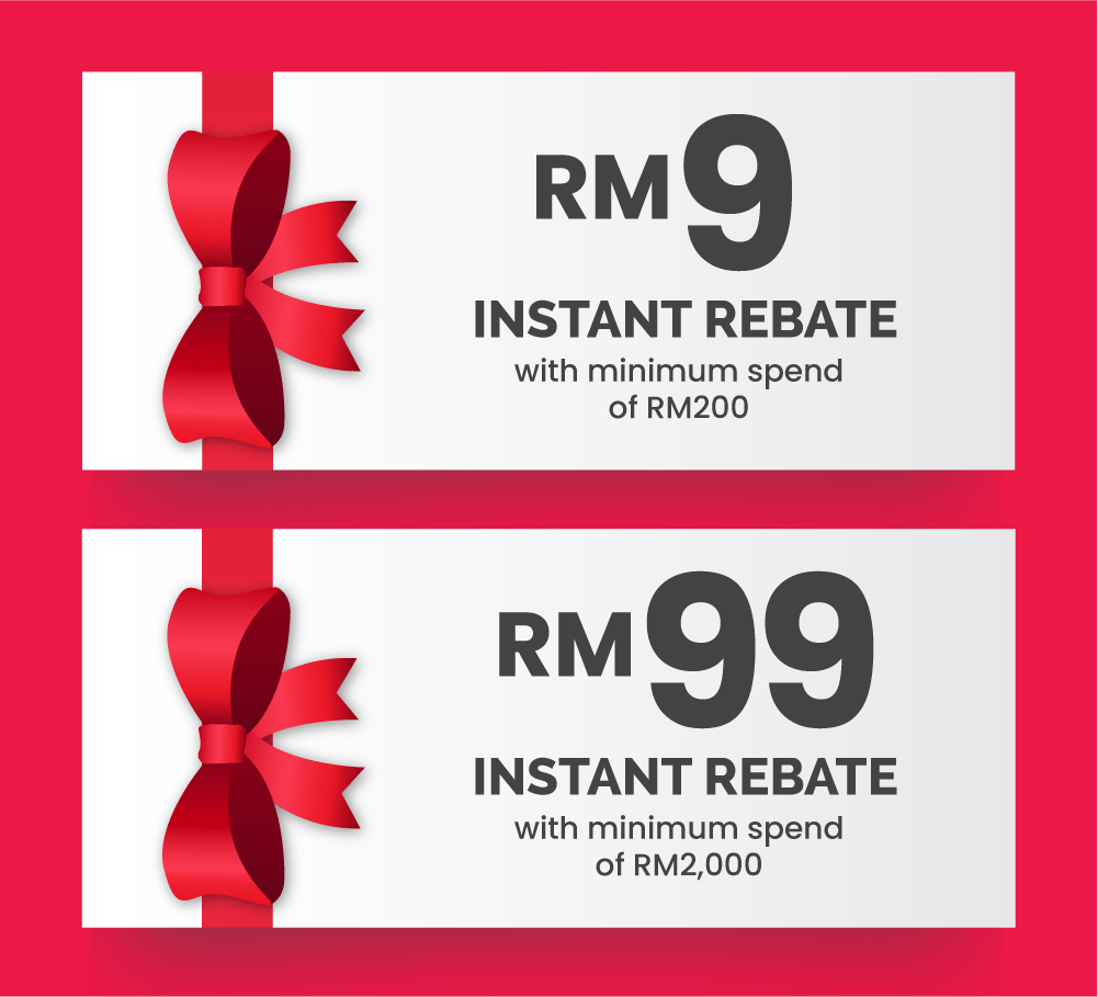The "Malaysia Day Mega Tech Drop" RM 9 Instant Rebate is applicable with a minimum spend of RM200 and above. RM99 Instant rebate is applicable with a minimum spend of RM2000 and above.