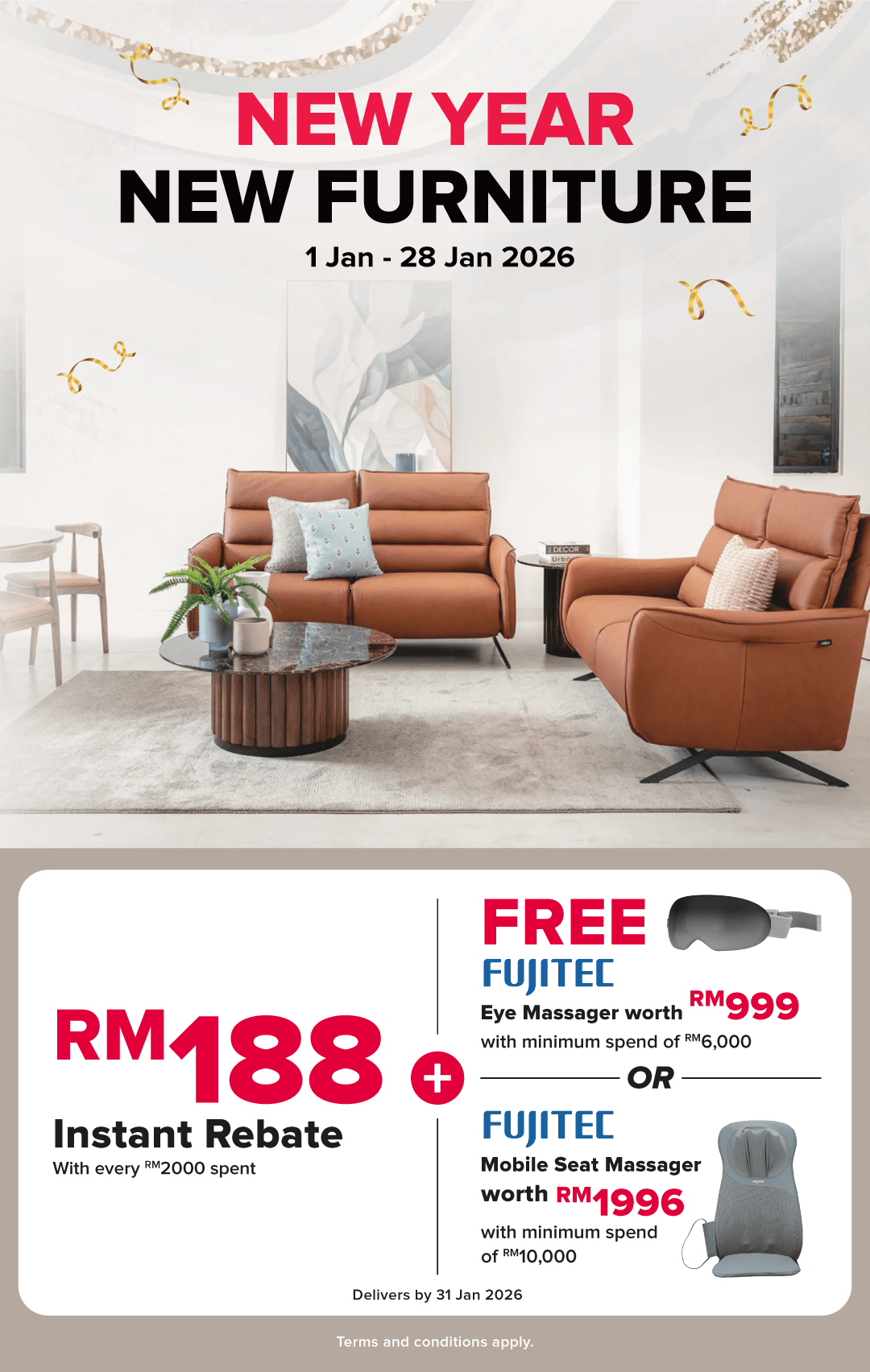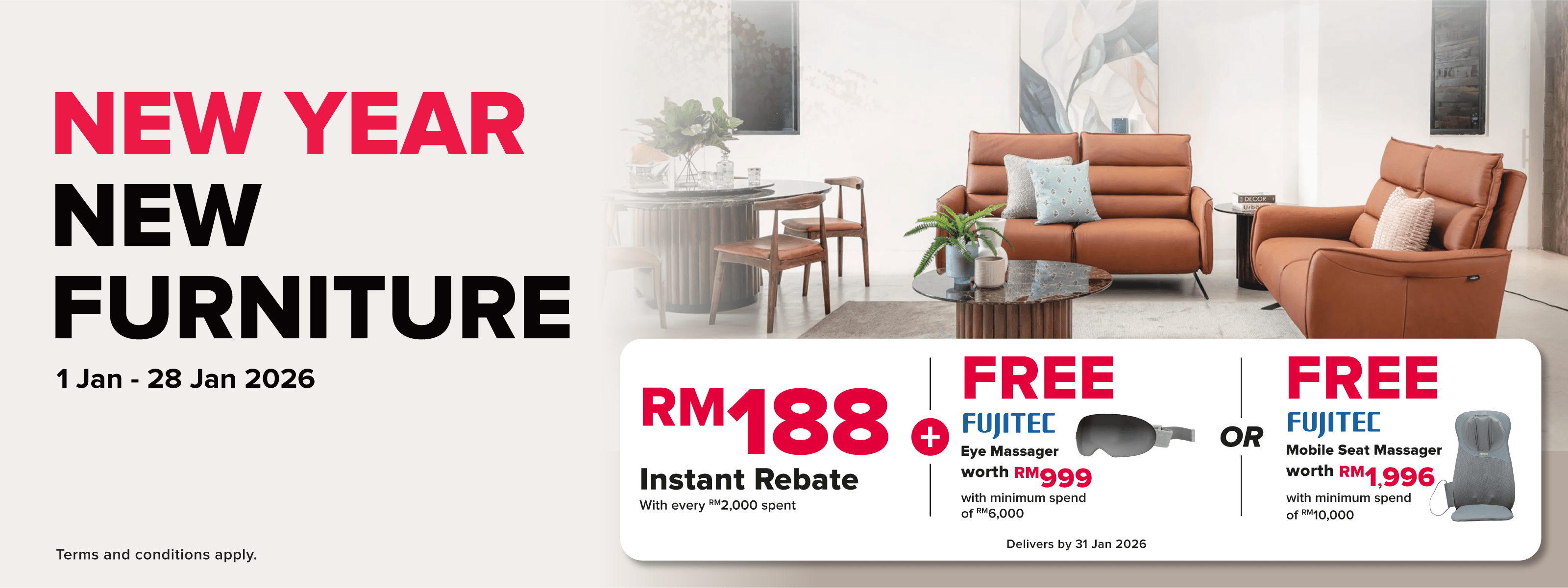 Enjoy RM188 Instant Rebate with every RM2000 spend on selected furniture products + Free Fujitec Eye Massager with minimum spend RM6000* or Fujitec Seat Massager with minimum spend RM10000!