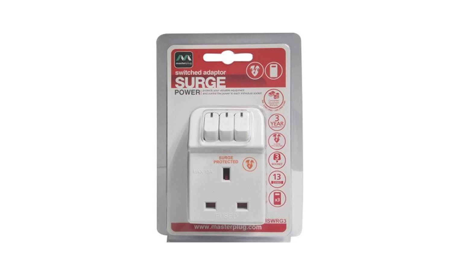 Control the power to three items from one socket, with this small, compact adaptor. This elegantly designed three-way adaptor protects against the damaging effects of surges and spikes. It is simple to use and is fitted with individual power indicators.