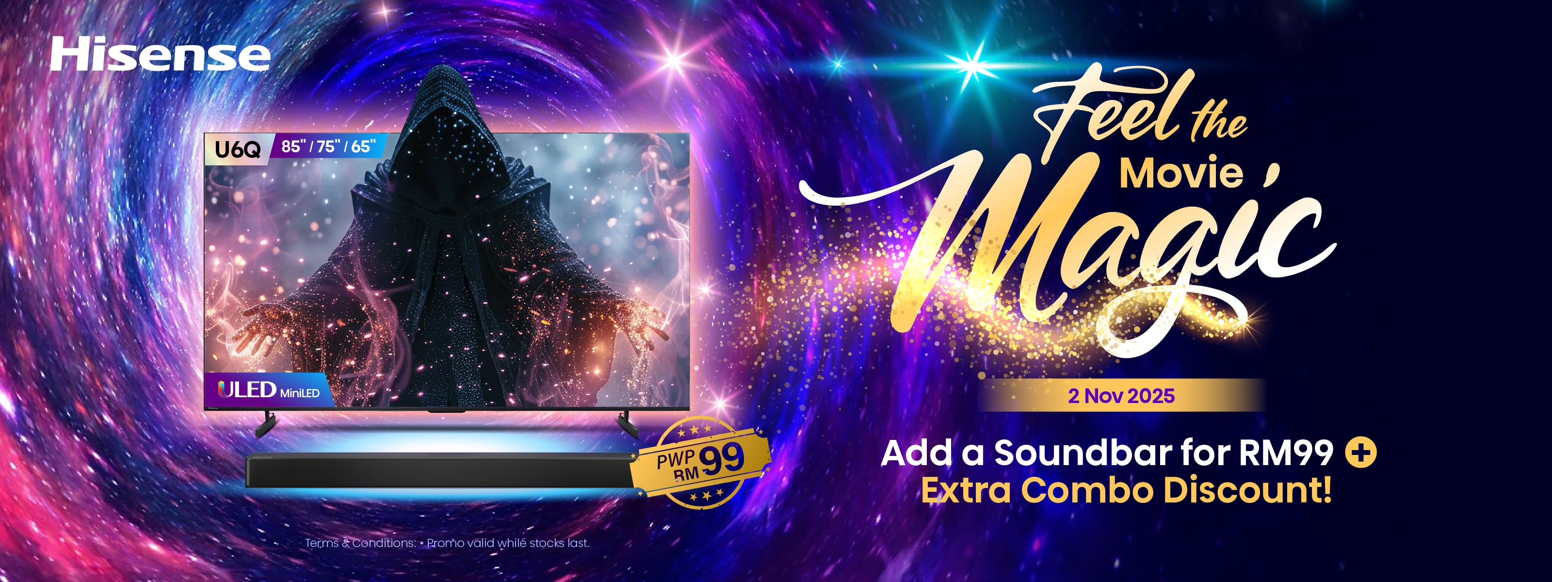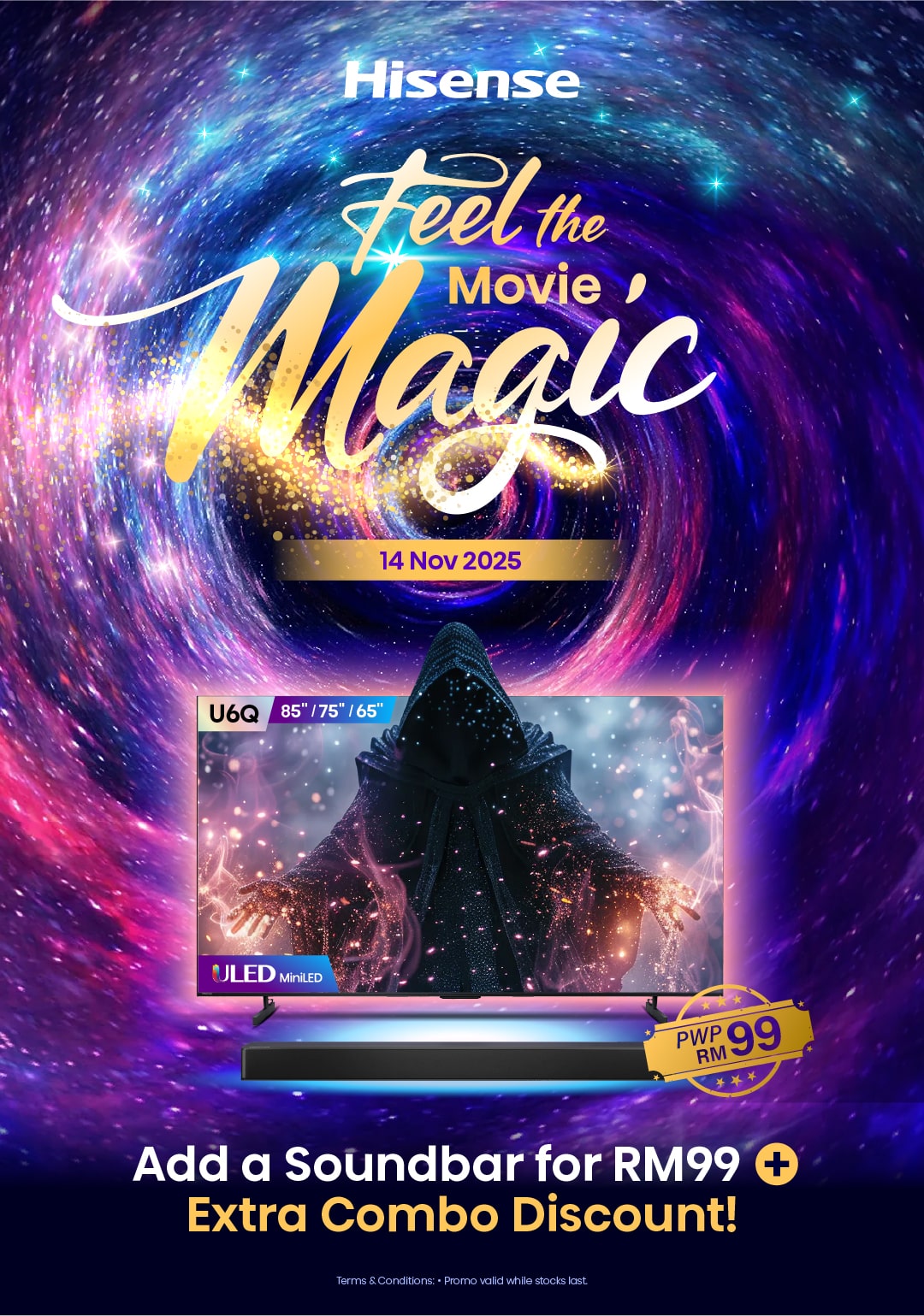 Experience cinematic brilliance with Hisense U6a Mini-LED TVs in 85", 75", and 65". From 1 Oct - 30 Nov, 2025, add a soundbar for just RM99 and enjoy extra combo discounts. Shop now and feel the movie magic!