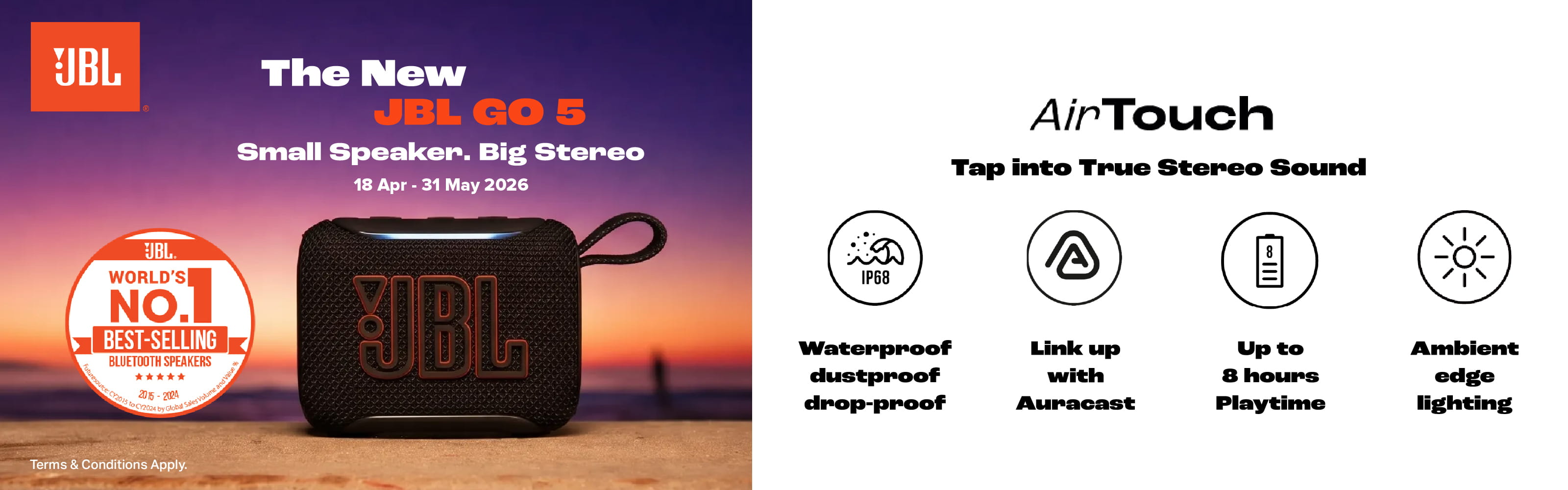 Experience big stereo sound in a compact package with the new JBL GO 5. Features 7 hours of playtime, IP67 waterproof design, and Auracast connectivity. Available now at Harvey Norman.