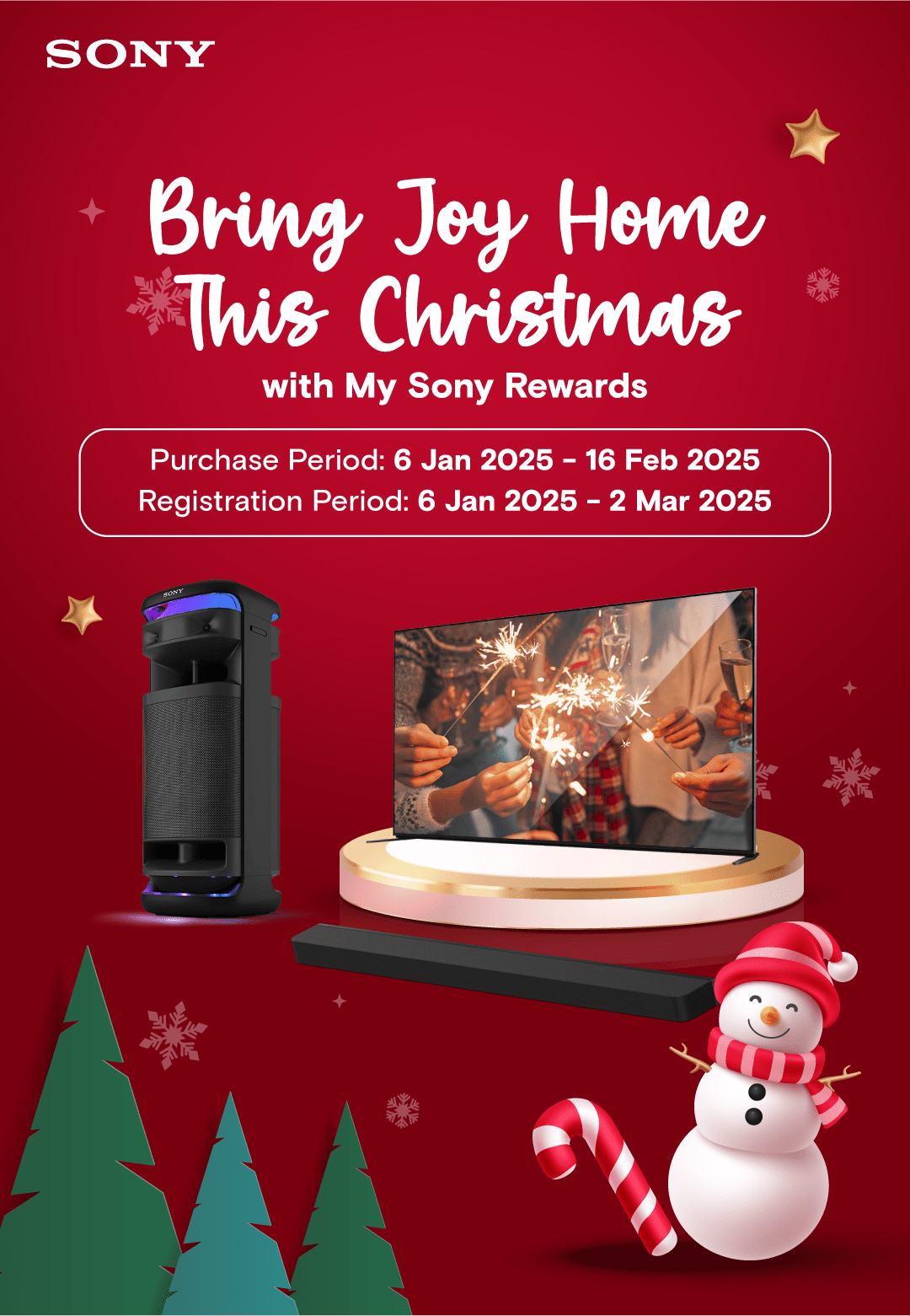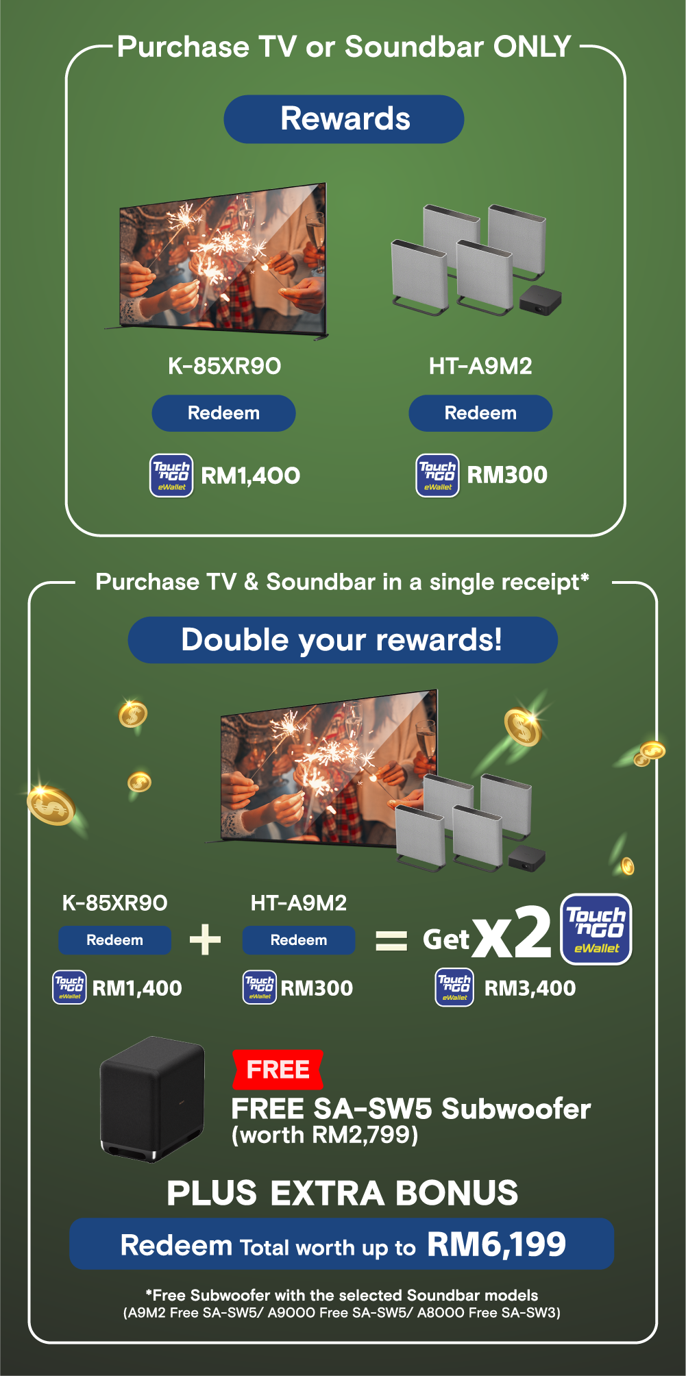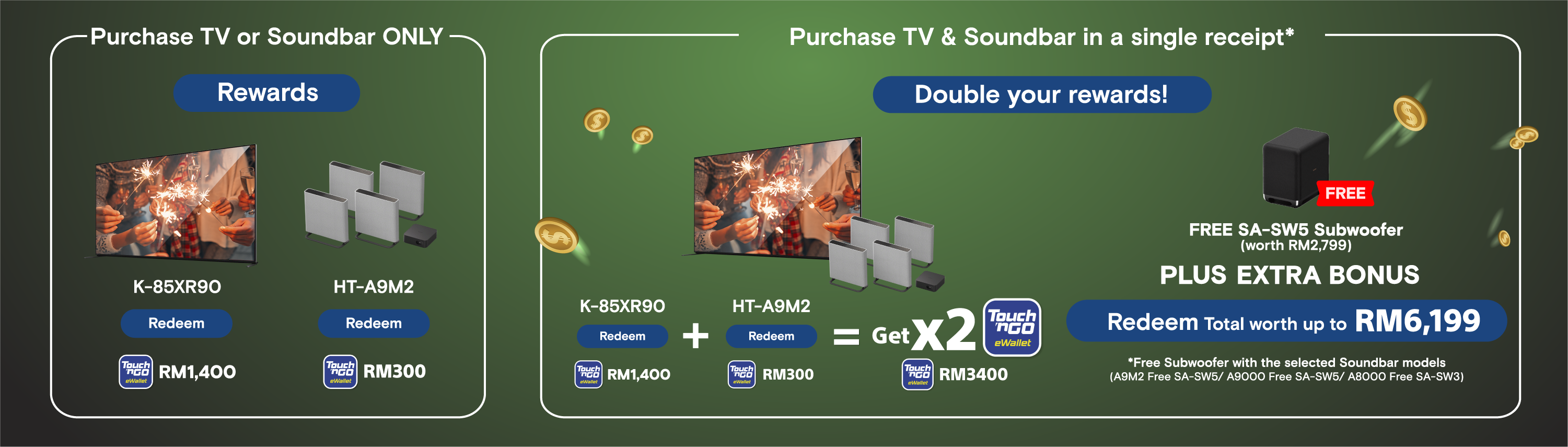 Purchase Eligible TV and Soundbar in a single receipt to receive DOUBLE the TNG Account! Get up to RM2800 worth of Touch N Go eWallet Credits.