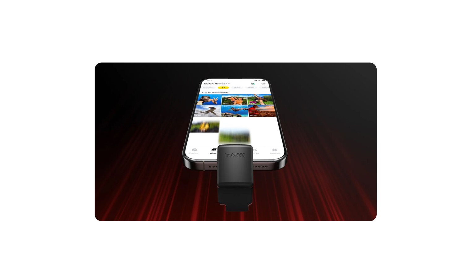 The Insta360 Quick Reader for your ACE or ACE PRO action camera allows you to record footage onto the module and transfer it to your phone or computer without eating up additional camera battery. By inserting a microSD card into the reader and plugging it into the USB-C port of your ACE or ACE PRO, you can store data directly onto the device while you shoot. To preview and edit the footage while on the go, simply insert the Lightning or USB-C connector into a compatible mobile device and open the Insta360 app. Files can also be transferred and accessed through a personal computer.