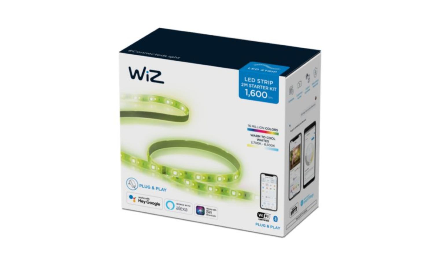The smart WiZ LED full color strip lets you bring beautiful indirect light into your home. Simply stick the flexible strip to any surface you like – tray ceilings or under cabinets. Starter kit comes with a 2 meter strip light, controller and power driver – no additional equipment required. Can easily be trimmed for customized fit and extended up to 10 meters (extension sold separately). Wi-Fi connected, 16 million colors and adjustable from warm white to daylight.