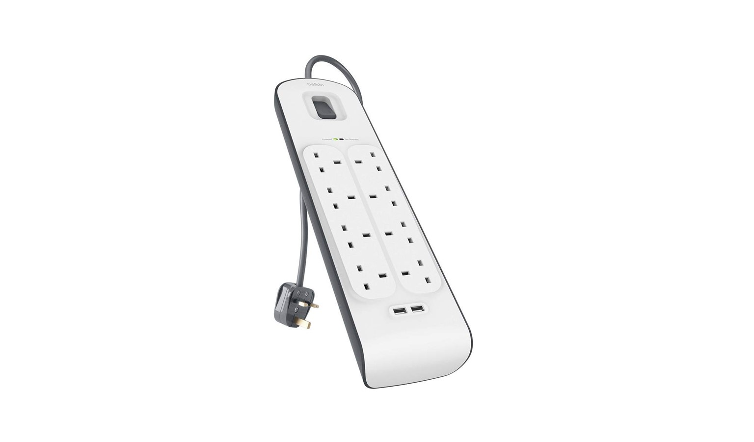 Keep your electronic devices protected from dangerous power surges and spikes with the Belkin 8-Outlet Surge Protection Strip with 2 USB Ports. Simply plug the surge protection strip into any AC wall outlet and connect up to eight AC and two USB devices to keep them safe from power surges, lightning strikes, and AC contamination.
